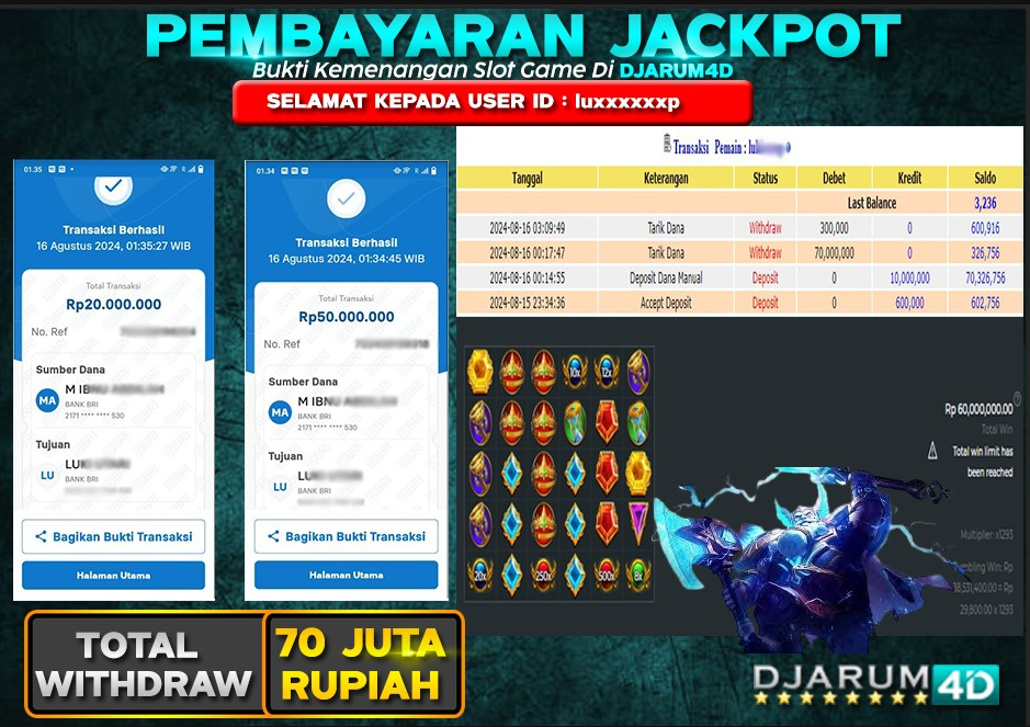 PEMBAYARAN JACKPOT RP.70,000,000,- TANGGAL 16 August 2024